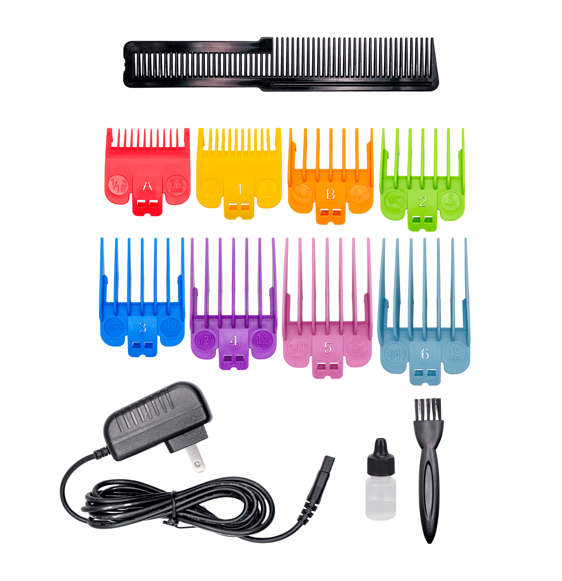 - Incluye: cepillo de limpieza, aceite, 8 peines guía #1/2, #1, #1 1/2, #2, #3, #4, #5 y #6, y un peine de corte
